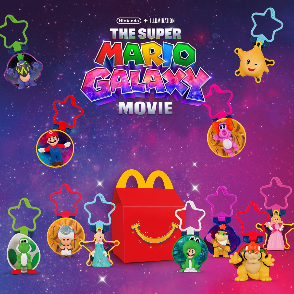 Bien sûr, les plus jeunes fans ne sont pas en reste avec le Happy Meal™ Super Mario Galaxy Movie. Chaque Happy Meal™ contient l’une des 12 figurines à collectionner, inspirées des personnages de Nintendo et du film d’Illumination. Chaque figurine est munie d’un clip pratique, idéal pour l’accrocher à un sac à dos comme porte-clés.