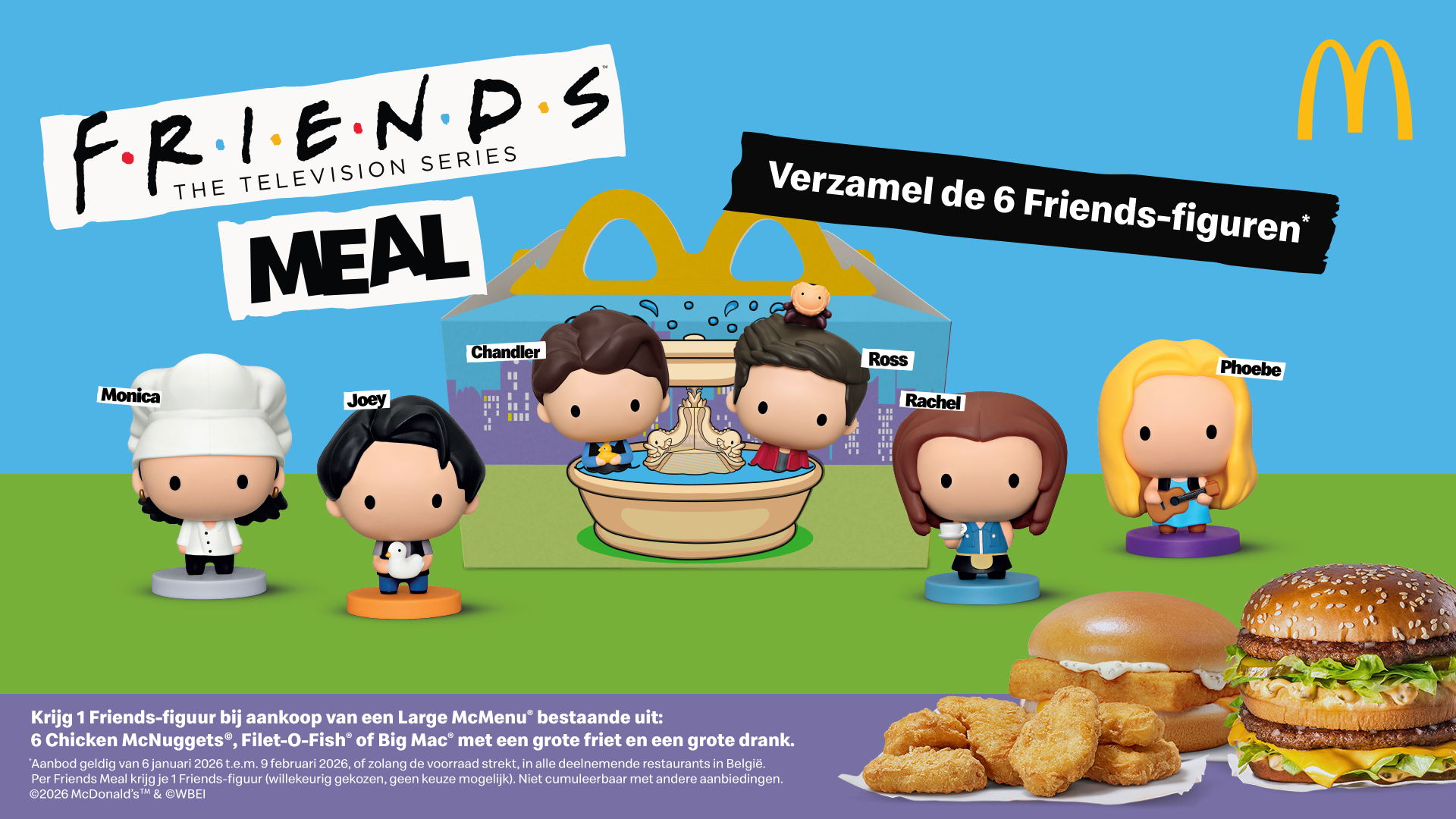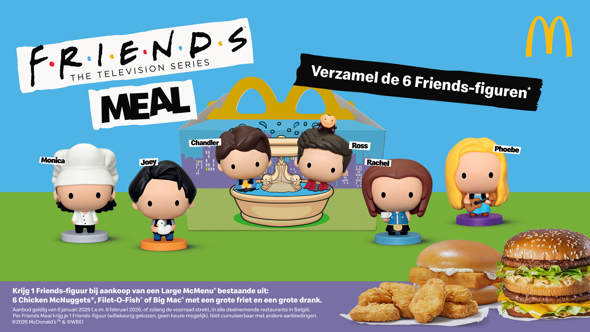 Diegem, 6 januari 2026 – Vanaf vandaag nodigt McDonald's België je uit om de exclusieve Friends Meal te ontdekken: een Large McMenu® geïnspireerd op de serie, en de apart verkrijgbare Monica’s Marinara Sauce om het af te maken. Bovendien ontvangen fans bij elke bestelling van de Friends Meal één van de 6 limited edition Friends-verzamelfiguurtjes. Want net als je favoriete Friends-personage, vertellen je McDonald’s gewoontes veel over wie je bent. Van onderhandelen over de laatste McNugget® tot weigeren je frietjes te delen… we hebben allemaal onze eigen manier om van onze maaltijd te genieten!
