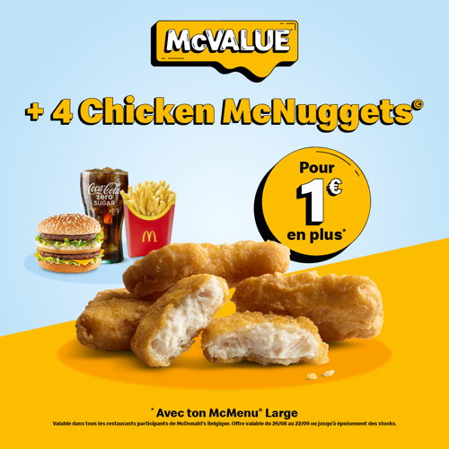 La première offre McValue ? Un bonus gourmand pour accompagner votre Large McMenu® pour seulement 1€ de plus. Dès le 26 août, vous pourrez compléter votre Large McMenu® avec 4 Chicken McNuggets® supplémentaires ou un délicieux Sundae, pour à peine 1 €. Pas besoin de relever des défis sur les réseaux sociaux, ni de réaliser des trucs dingues pour mériter votre récompense : il suffit de commander. Avec McValue, vous recevez vraiment plus que ce que vous attendiez. Dépêchez-vous car c’est une offre temporaire* !